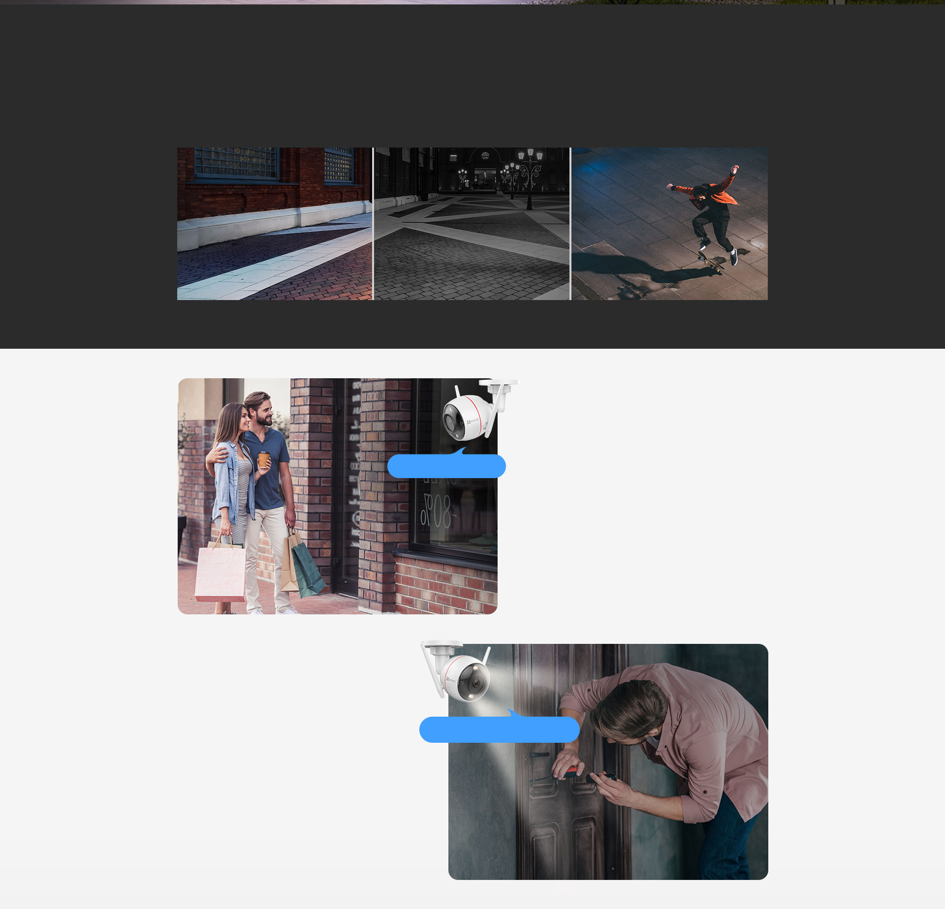 If you don't need extra lighting, just switch the camera to the black & white night vision via the EZVIZ App and still see 30 meters (98 ft.) far. A third night vision mode is unbelievably smart – it automatically turns on the spotlights upon detection of motion, so both notifications and remote look-ins will be in full-color.