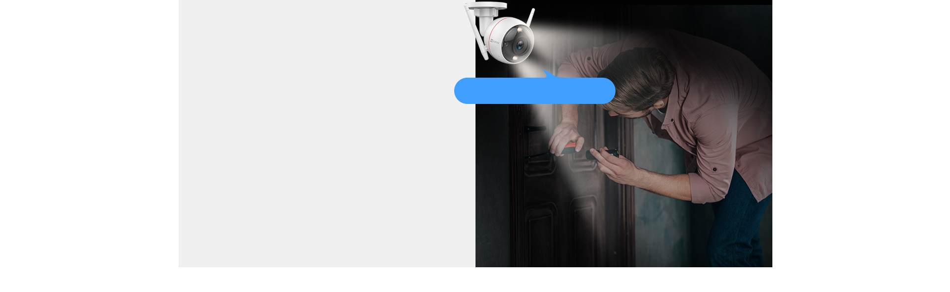 If you don't need extra lighting, just switch the camera to the black & white night vision via the EZVIZ App and still see 30 meters (98 ft.) far. A third night vision mode is unbelievably smart – it automatically turns on the spotlights upon detection of suspicious motion, so both notifications and remote look-ins will be in full-color.